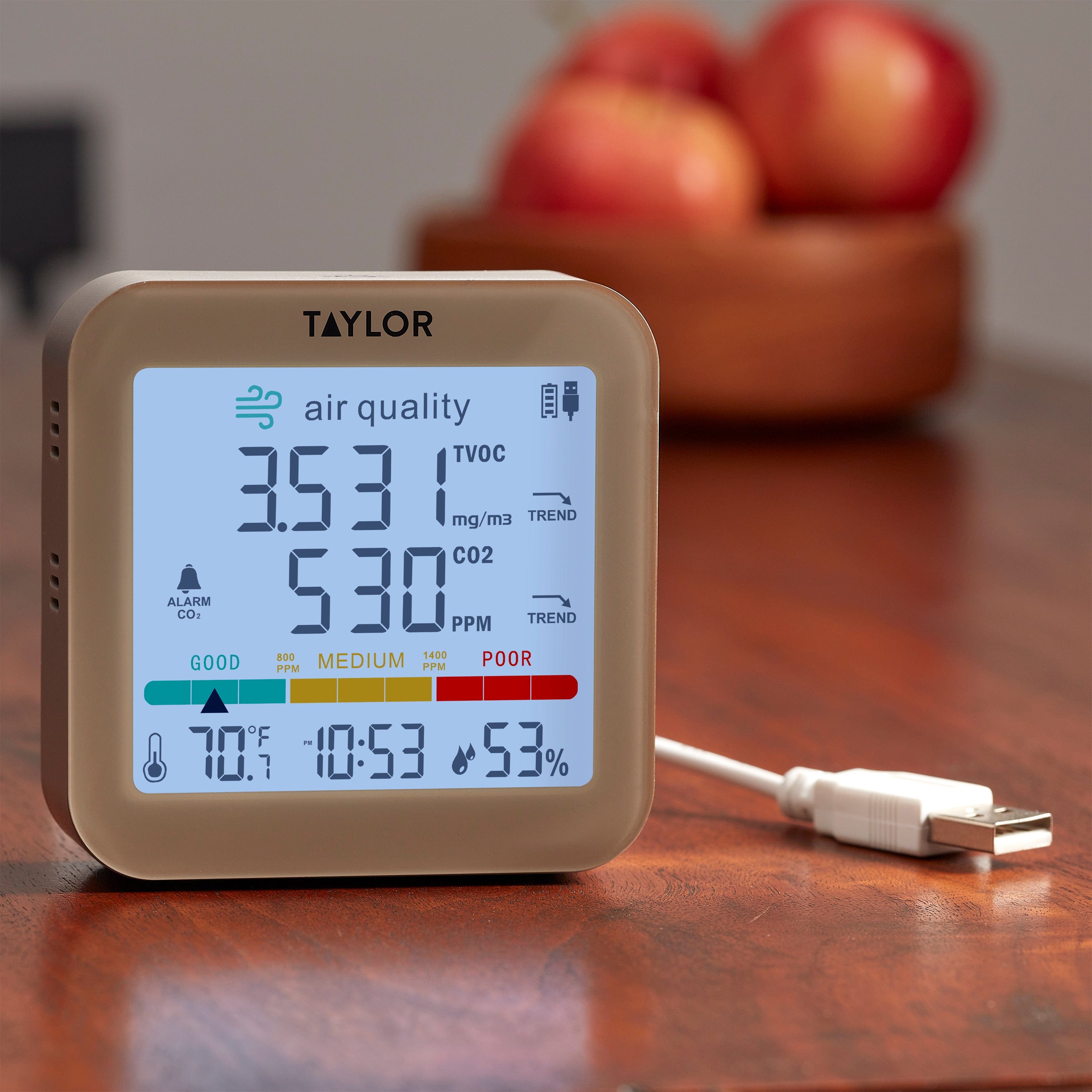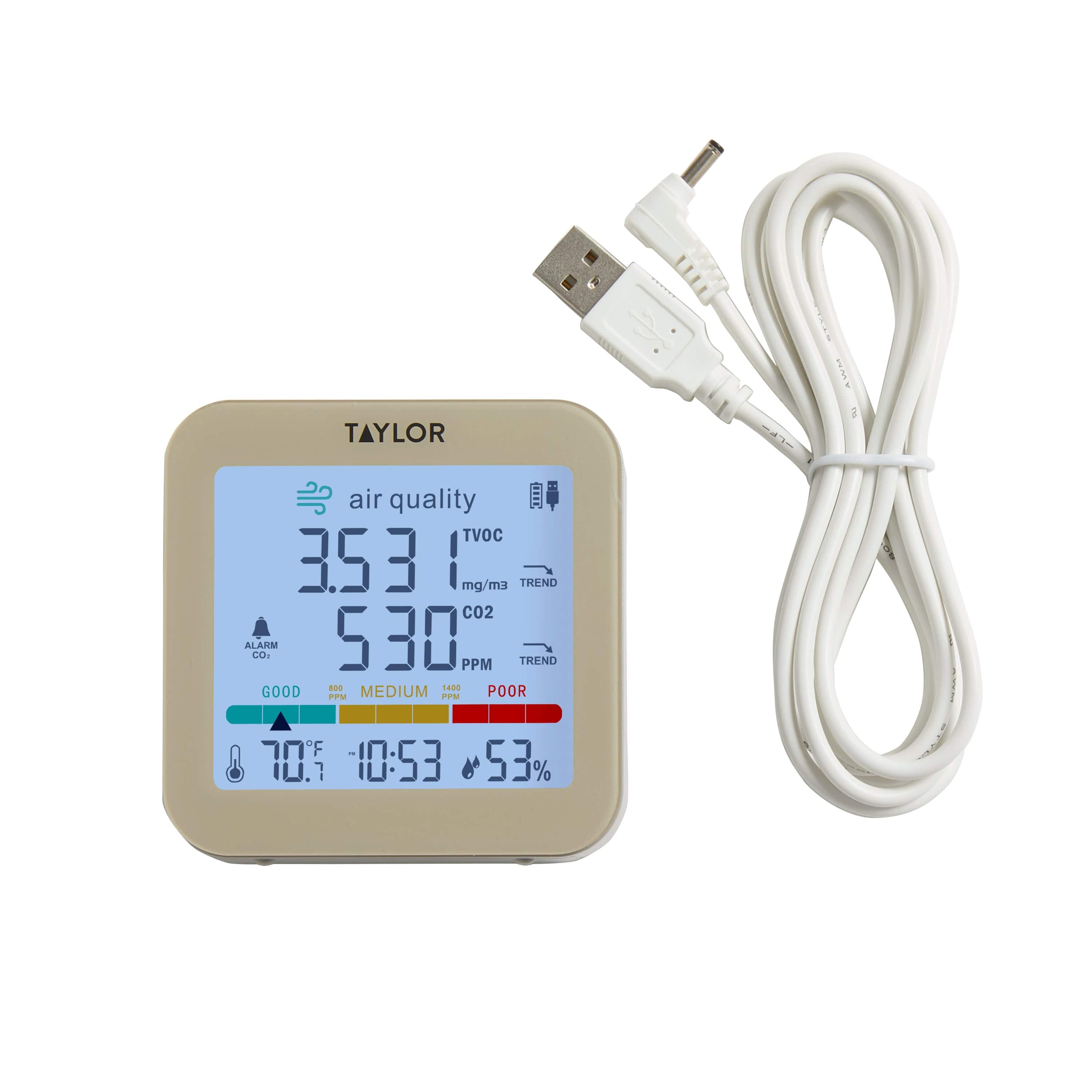 Monitoree fácilmente la calidad del aire interior con este confiable y preciso monitor de TVOC y CO2. El monitor de calidad del aire digital Taylor mide continuamente los TVOC (compuestos orgánicos volátiles totales) y el CO2 (dióxido de carbono). La unidad se puede programar para que emita una alerta audible cuando los niveles de CO2 aumenten hasta la clasificación "POBRE" o un nivel establecido según la sensibilidad personal. Las barras de tendencia se actualizarán cada hora y mostrarán una flecha de tendencia ascendente, neutra o descendente. Este dispositivo está diseñado solo para uso en interiores. Para obtener lecturas óptimas del sensor, mantenga el dispositivo alejado de la luz solar directa y en un espacio abierto de menos de 500 pies cuadrados. Para obtener mejores resultados, manténgalo enchufado con el cable USB.